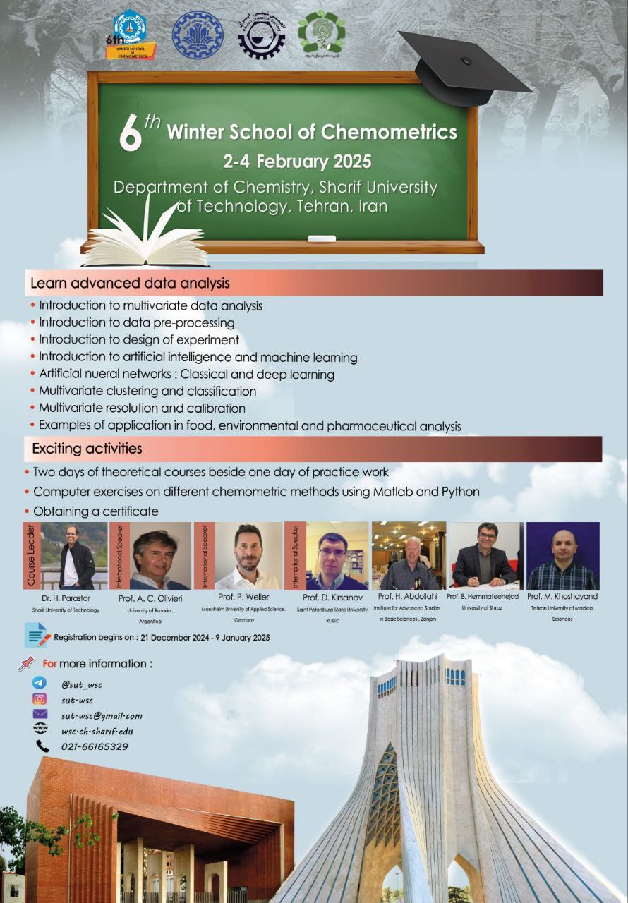 ششمین مدرسه زمستانه کمومتریکس در بهمن ماه سال جاری در دانشگاه صنعتی شریف برگزار می گردد.