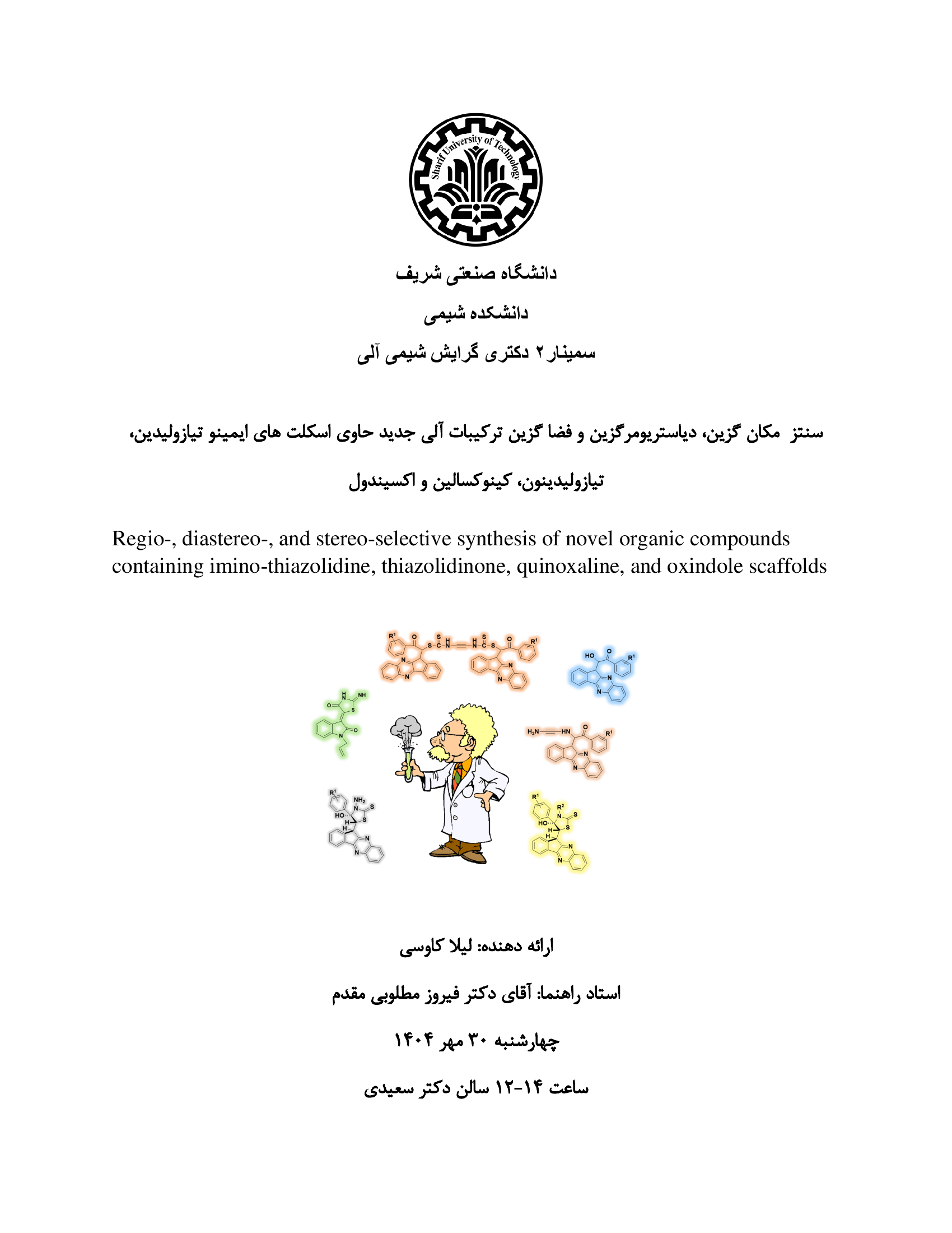 سمینار 2 دکتری گرایش شیمی آلی سنتز مکان گزین، دیاستریومرگزین و فضا گزین ترکیبات آلی جدید حاوی اسکلت های ایمینو تیازولیدین، تیازولیدینون، کینوکسالین و اکسیندول سنتز مکان گزین، دیاستریومرگزین و فضا...